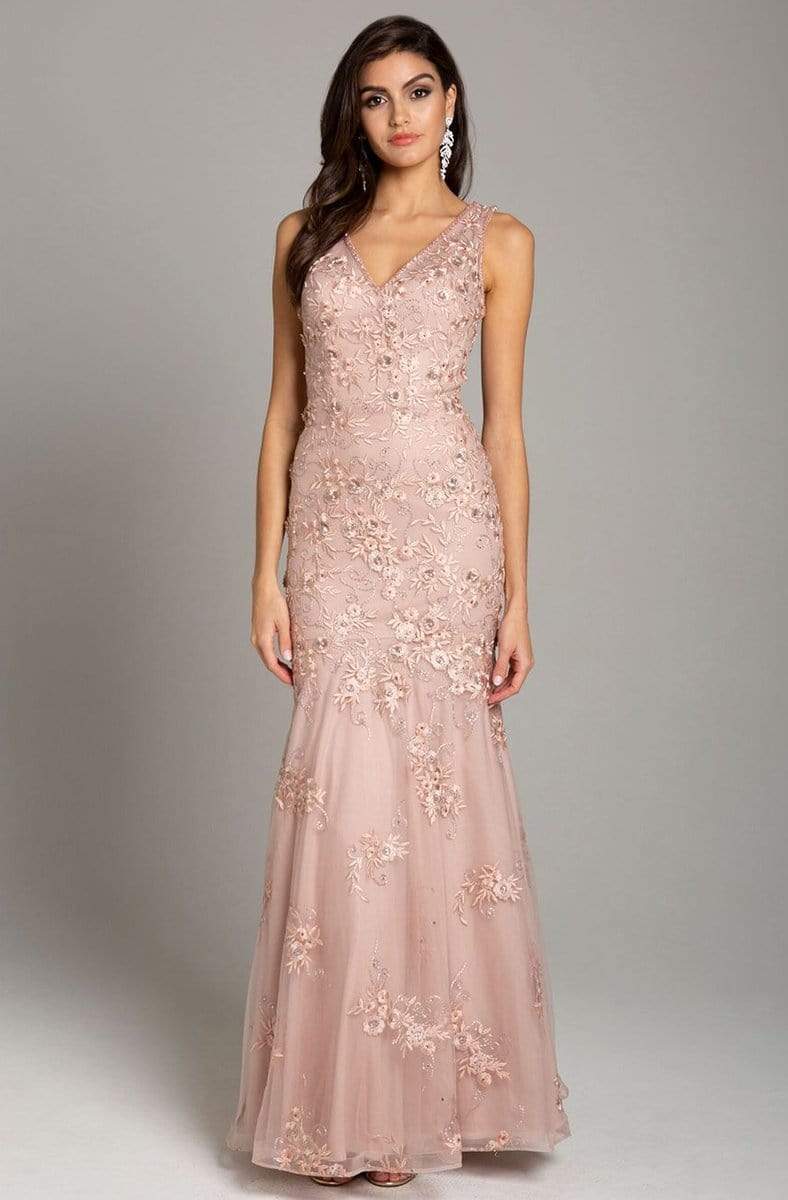 Step into elegance with Lara Dresses' 29869. This Lara long-sleeveless dress features intricate floral lace appliques, a fitted bodice, and a V-back with zipper closure. Its mermaid-shaped skirt adds allure to your silhouette. Elevate your evening with this glamorous Lara dress, available in Blush. Make heads turn, and hearts flutter in Lara's timeless sophistication.